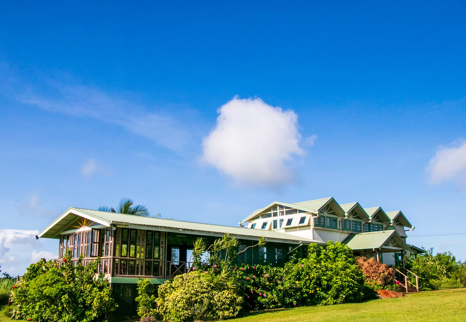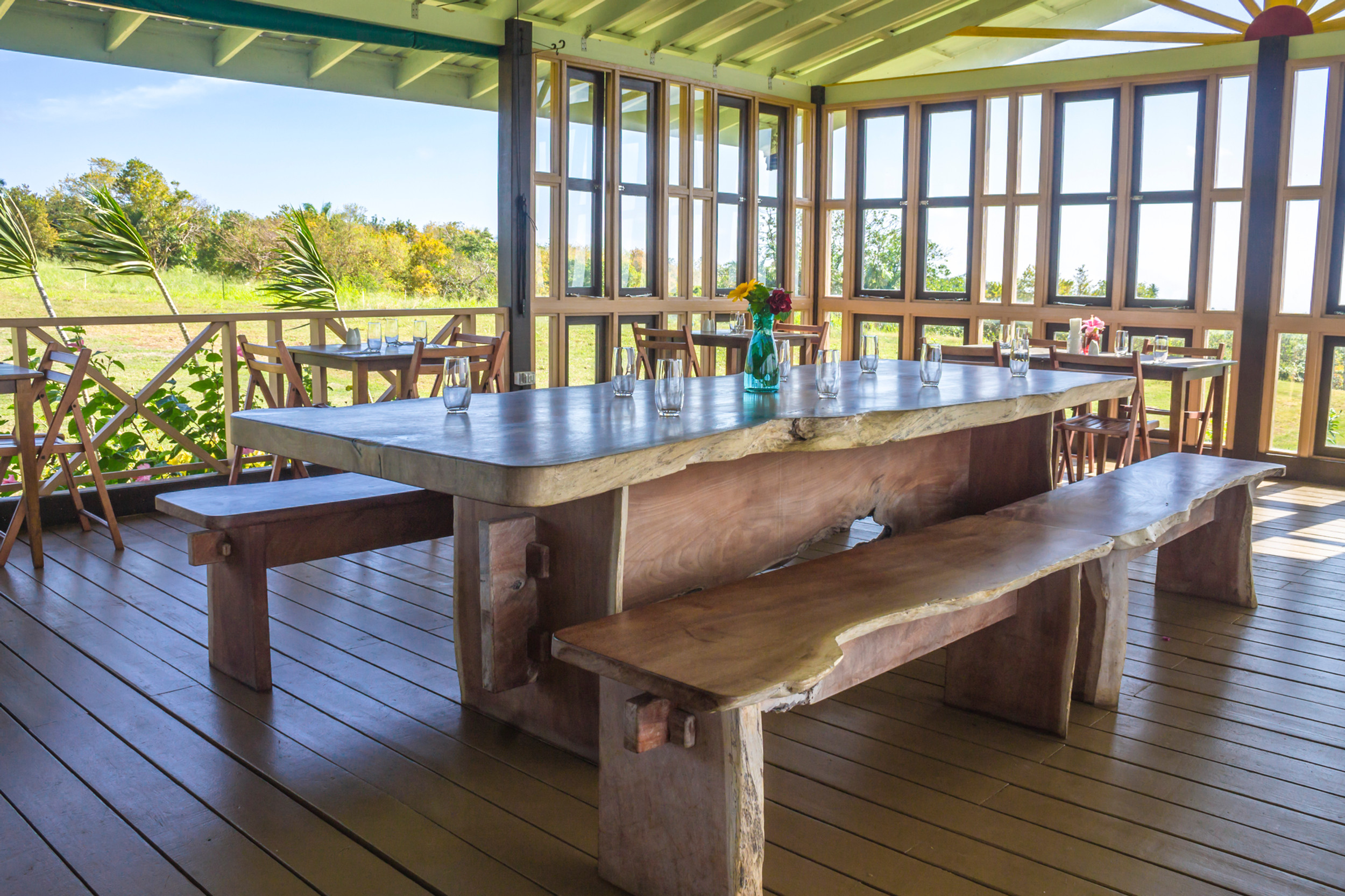 Barbados is not short on picturesque, but Peg offers a different kind of beauty. The cream-painted walls and turquoise window frames of the café echo the calm of its inland surroundings, a palette that feels closer to peace than performance. The grass around the building is sunburnt and parched, evidence of a dry spell and the farm’s honest entanglement with the land it inhabits. But the view — that sweeping, open-breath panorama down to the Atlantic — is breathtaking. Four wind turbines spin slowly in the distance, nearer to the coastline than to us, adding a quiet modernity to the horizon. A single tree just beyond the dining room pulses with wild energy: hummingbirds flit, mongeese dart, bees drone like miniature generators. It feels alive, not curated. This isn’t the Barbados sold in glossy brochures — and that’s precisely the point.